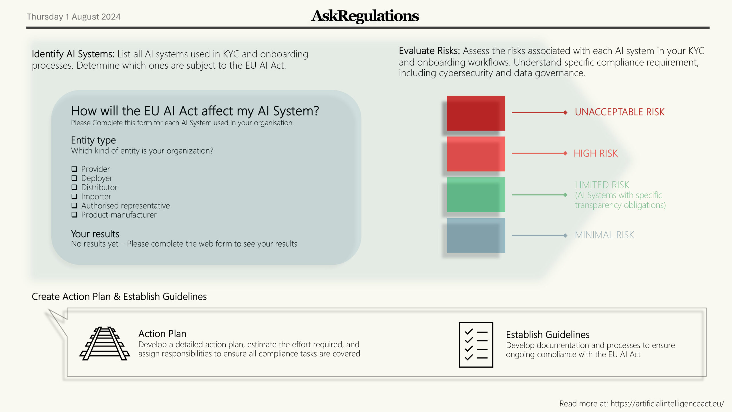 1. Identify AI Systems: List all AI systems used in KYC and onboarding processes. Determine which ones are subject to the EU AI Act.